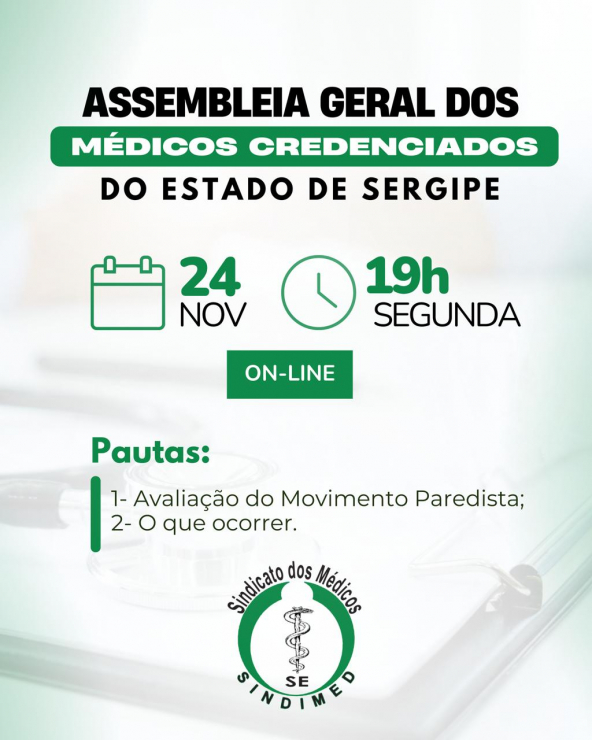 O Sindicato dos Médicos do Estado de Sergipe, portador de CNPJ n°13.370.002/0001-14, situado na Rua Celso Oliva, nº 481, Bairro 13 de Julho, Aracaju/SE, CEP 49.020-090, vem convocar TODOS OS MÉDICOS CREDENCIADOS DO ESTADO DE SERGIPE, PARA ASSEMBLEIA GERAL, a ser realizada no dia 24/11/2025, SEGUNDA-FEIRA, de forma on-line, às 19h, em primeira convocação, e às 19h15, em segunda convocação, conforme preceitua o Capítulo Sexto – Das Assembleias Gerais, do Estatuto do sindicato, a fim de se discutir e deliberar sobre as seguintes pautas: